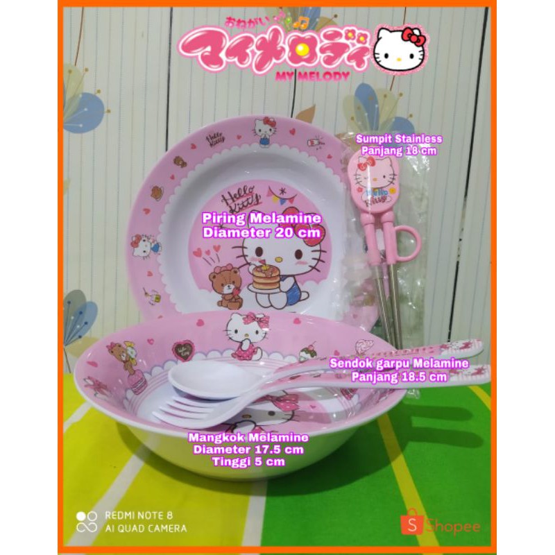 Piring diameter 20 cmMangkuk tinggi 5 cm dan diameter 17.5 cmSendok dan Garpu panjang 18.5 cmSumpit belajar stainless panjang 18 cm Catatan:Motif gambar Hello Kitty akan dikirim sesuai stok yang ada.#piring #he