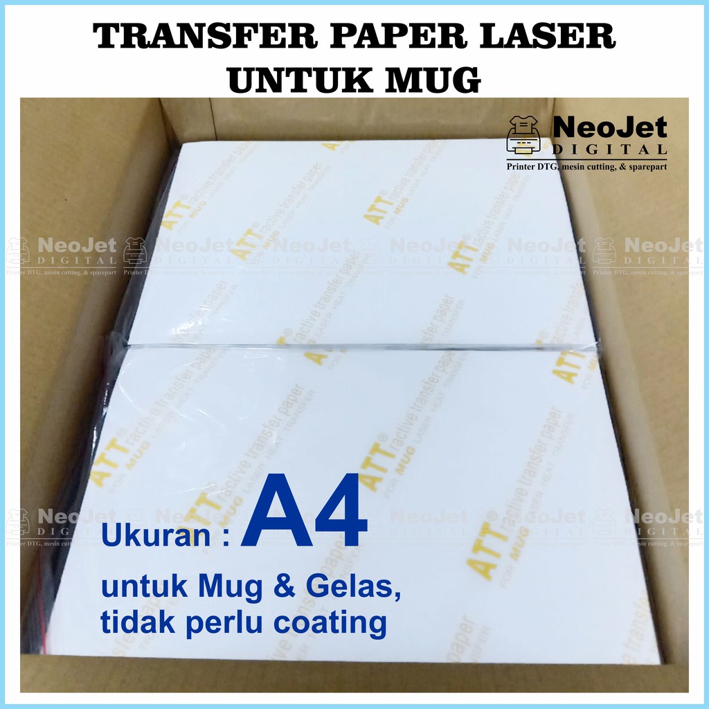 Harga per lembarUKURAN : A4Kertas Transfer Laser Mug untuk sablon transfer di mug dan gelasDengan teknologi terbaru dalam kemampuan mentransfer gambar tanpa meninggalkan sisa bahan yang menempel pada mug. Sablon dalam bentuk tulisan dan design yang terpisah bisa dikerjakan di kertas ini tanpa perlu proses Cutting/gunting.Kertas di print menggunakan Printer LaserJet/Toner, tidak bisa menggunakan Printer Inkjet/Tinta.Kertas ini cocok untuk kebutuhan sablon di mug atau gelasProses transfer harus menggunakan mesin heat press agar hasil sablon tahan lama.Kelebihan :• Proses sablon lebih cepat• Bisa disablon pada Mug/gelas tanpa coating• Tidak meninggalkan sisa bahan polymer atau background putih• Tidak perlu melakukan proses menggunting /Cutting• Hasil sablon terlihat terang dan halus• Print menggunakan Printer Laser ( Teknologi Printer LED)Cara Penggunaan:• Design gambar yang diinginkan• Print dengan gambar Mirror (gambar terbalik)• Setting Printer dengan kualitas Photo• Setting Printer dengan pilihan jenis kertas / Paper Type : Label, stiker atau Envelope• Tempelkan kertas yang sudah di print langsung ke mug/gelas (untuk gelas perlu penambahan silikon pad) dengan bantuan selotip tahan panas• Atur mesin Heat press dengan Temperature: 155-160 °C• Press selama 180 Detik dengan tekanan Heavy• Tunggu sampai dingin baru kelupas kertas lapisan atas (Cold Peel)Printer yang direkomendasikan seperti Printer LaserJet OKI karena Printer tersebut menggunakan toner khusus, sehingga daya tahan cuci lebih