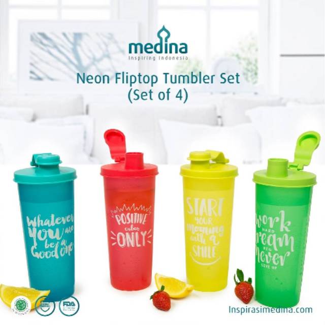Goodness in Every moodApapun suasana hati hari ini, bawa pesan positif ke manapun pergi.Tutup Fliptop Liquid proof pastikan semuanya aman terkendaliDengan 4 Warna berbeda dan kalimat berisi pesan positif berbeda di setiap Tumbler-nya,Jadikan hari penuh semangat dimulai dari Tumbler yang anda bawa.Garis takarnya, memastikan bahwa hidrasi harian anda cukup setiap harinyaCocok untuk ditaruh di lemari pendingin atau lemari pembeku dan Bisa dipakai di Microwave 1 Set Neon Fliptop Tumbler Set, terdiri dari:- 4 Tumbler berbeda warna yang cerah: Merah, Hijau, Biru, dan Kuning- Kapasitas 510 ml, Ukuran 8 x 19.2 cmProduk Eksklusif dari Medina#tumblerset#tumblerkeren#tumblerantitumpah#tumblerkedap