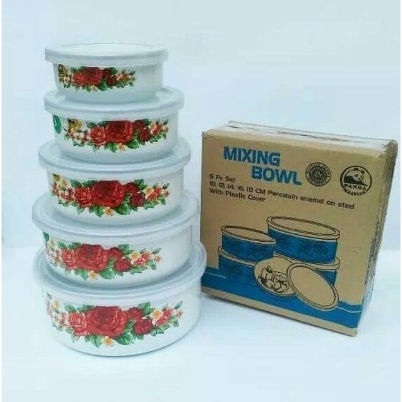 Mixing Bowl 5 Susun Motif BungaMixing Bowl 5 susun mangkuk praktis dalam satu set tidak mudah pecah dan mudah perawatan serta awet digunakan terdapat tutup masing-masing bowl. berapa banyak makanan yang akan dibawa tinggal sesuaikan ukuran bowl, dengan tampilan elegan warna dasar putih bermotif buah menjadikan mixing bowl tampil mewahSpesifikasi Produk :- Bahan : Porcelain Enamel dan tutup selware plastic lekat- Dimensi : Mixing bowl uk 10, 12, 14, 16, 18 cm (Set)- 5Pcs Mixing Bowl (set)- Warna putih motif BungaBerat : 1.1kg9